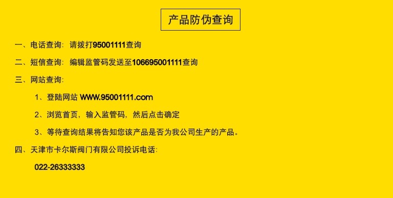 从2011年10月1日起,本公司所有产品均有双防伪监管码(即合格证、阀门上各一个监管码,均可查询真伪)谨防假冒,谢谢!